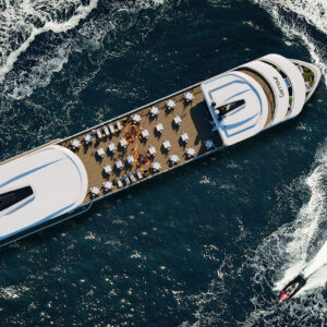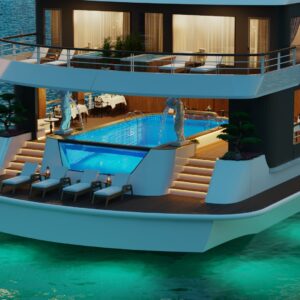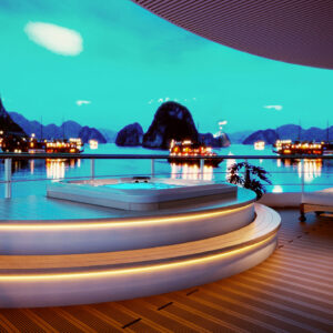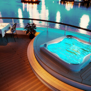 Bể bơi được đặt ở vị trí đuôi tàu tạo ra cảm giác như nước bể bơi liên kết với không gian bao quanh mà không có ranh giới rõ ràng, tạo ra một trải nghiệm thú vị và thư giãn. Việc sử dụng nước khoáng thiên nhiên trong bể bơi có thể mang lại nhiều lợi ích cho sức khỏe của hành khách, với các khoáng chất tự nhiên có thể giúp thư giãn cơ thể và tái tạo năng lượng, phù hợp với mọi lứa tuổi. Ngoài ra, việc có bể bơi 4 mùa cũng tạo điều kiện cho hành khách có thể tận hưởng trải nghiệm suốt cả năm, không bị ảnh hưởng bởi thời tiết.