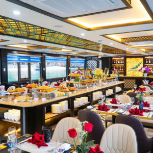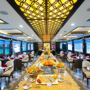 12h00: Du khách thưởng thức bữa trưa Buffet cao cấp với những món ăn Hải sản tươi ngon đặc sắc của vùng biển Hạ Long cũng như các món ăn truyền thống của Việt Nam. (Nếu tàu chạy dưới 20 khách, Quý khách sẽ được phục vụ ăn trưa theo Set Menu)